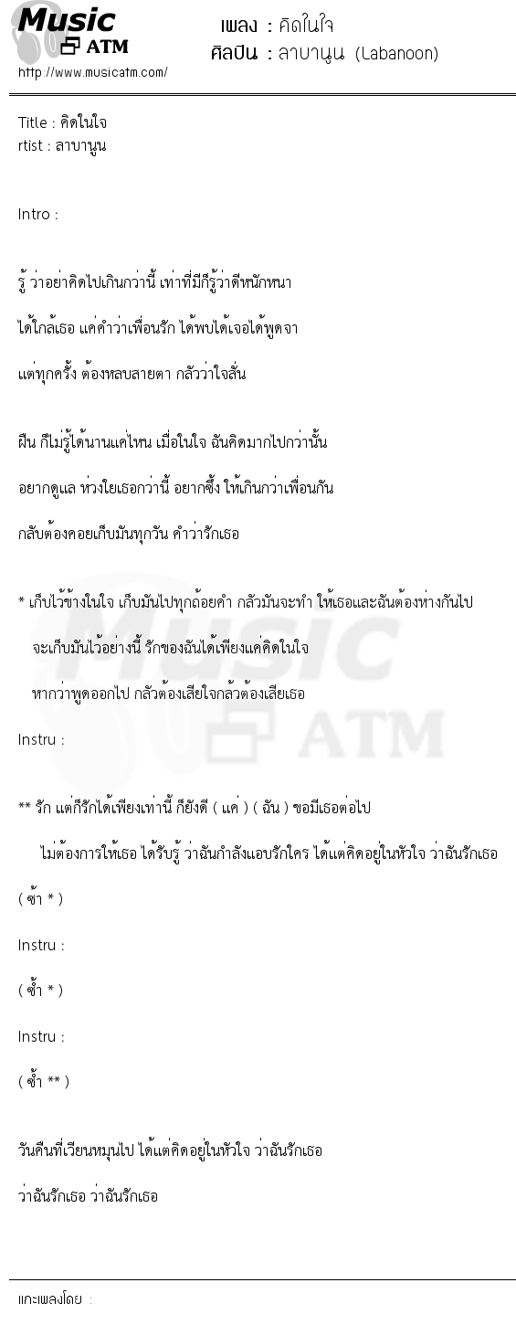 การค้นหาที่เกี่ยวข้องกับ เนื้อเพลง คิดในใจ – ลาบานูน (Labanoon).